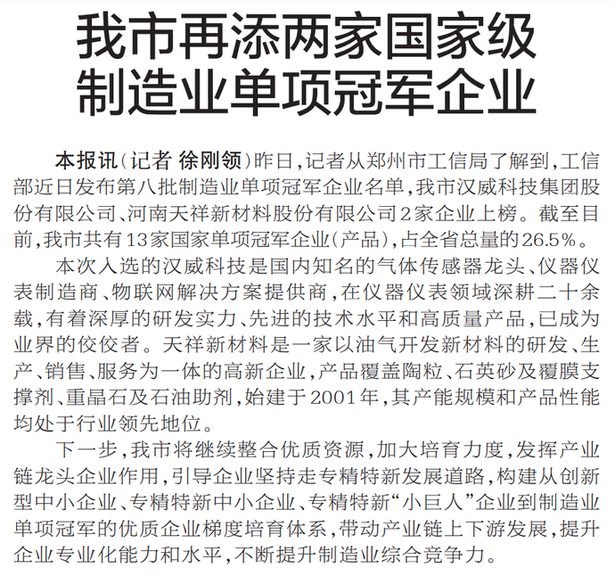 昨日,记者从郑州市工信局了解到,工信部近日发布第八批制造业单项冠军企业名单,我市汉威科技集团股份有限公司、河南天祥新材料股份有限公司2家企业上榜。截至目前,我市共有13家国家单项冠军企业(产品),占全省总量的26.5%。(今日《郑州日报》1版)