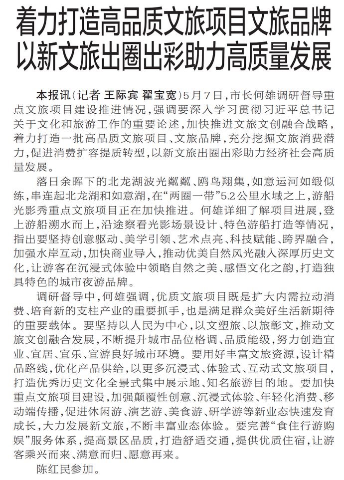 5月7日,市长何雄调研督导重点文旅项目建设推进情况,强调要深入学习贯彻习近平总书记关于文化和旅游工作的重要论述,加快推进文旅文创融合战略,着力打造一批高品质文旅项目、文旅品牌,充分挖掘文旅消费潜力,促进消费扩容提质转型,以新文旅出圈出彩助力经济社会高质量发展。(今日《郑州日报》1版)