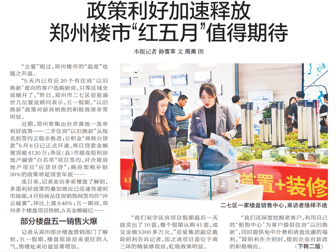 “5天内已有近20个有住房‘以旧换新’意向的客户选购新房,只等区域全面铺开了。”昨日,郑州市二七区亚星盛世几位置业顾问表示,五一假期,“以旧换新”政策对新房销售的积极效果非常明显。(今日《郑州日报》1版、2版)