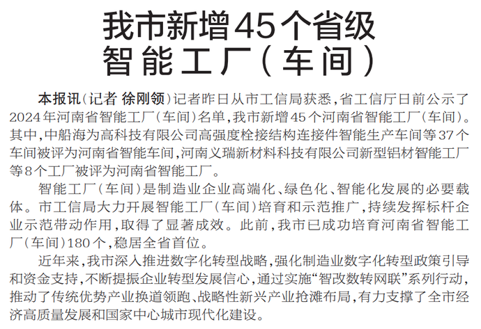 记者昨日从市工信局获悉,省工信厅日前公示了2024年河南省智能工厂(车间)名单,我市新增45个河南省智能工厂(车间)。其中,中船海为高科技有限公司高强度栓接结构连接件智能生产车间等37个车间被评为河南省智能车间,河南义瑞新材料科技有限公司新型铝材智能工厂等8个工厂被评为河南省智能工厂。(今日《郑州日报》2版)