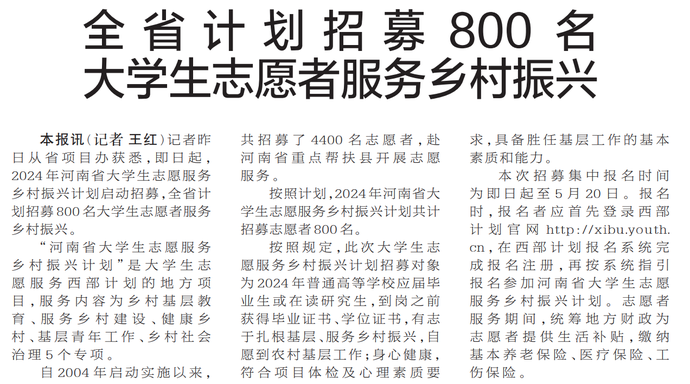 记者昨日从省项目办获悉,即日起,2024年河南省大学生志愿服务乡村振兴计划启动招募,全省计划招募800名大学生志愿者服务乡村振兴。(今日《郑州日报》2版)