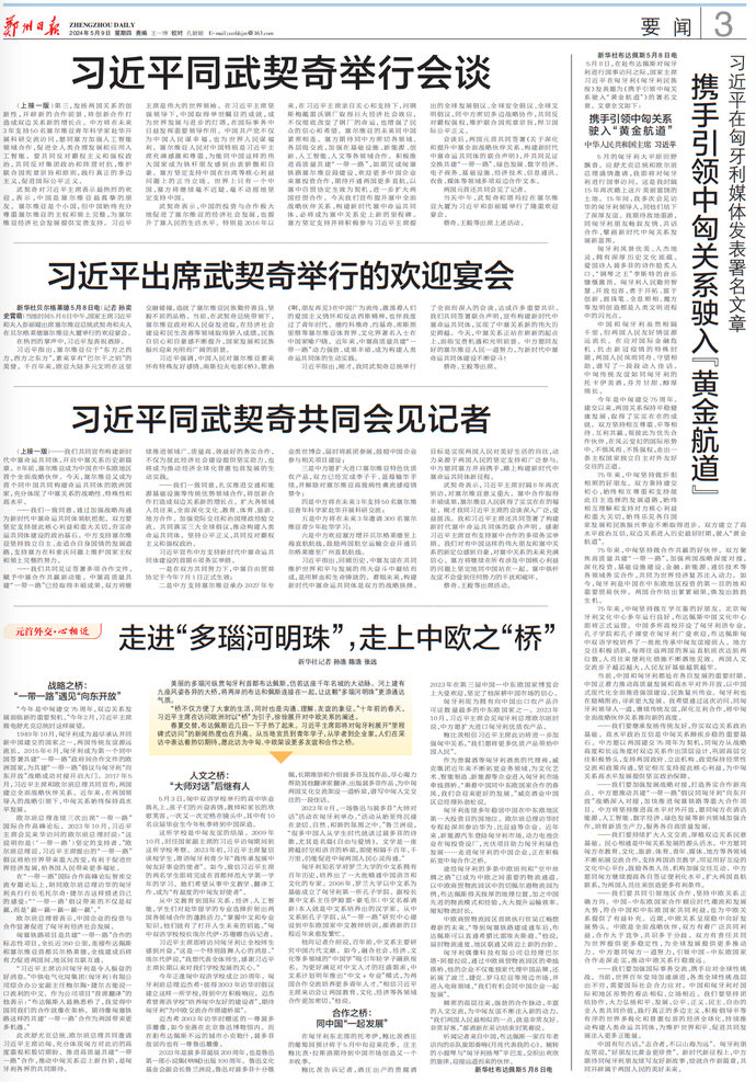 5月8日,在赴布达佩斯对匈牙利进行国事访问之际,国家主席习近平在匈牙利《匈牙利民族报》发表题为《携手引领中匈关系驶入“黄金航道”》的署名文章。(今日《人民日报》2版)