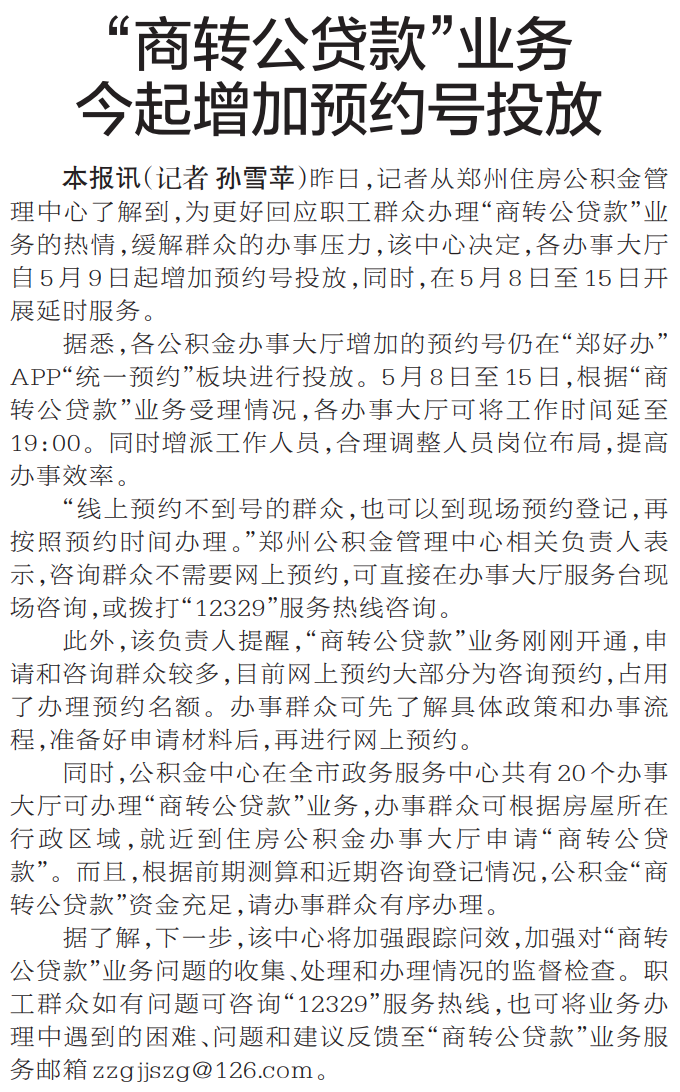 昨日,记者从郑州住房公积金管理中心了解到,为更好回应职工群众办理“商转公贷款”业务的热情,缓解群众的办事压力,该中心决定,各办事大厅自5月9日起增加预约号投放,同时,在5月8日至15日开展延时服务。(今日《郑州日报》5版)