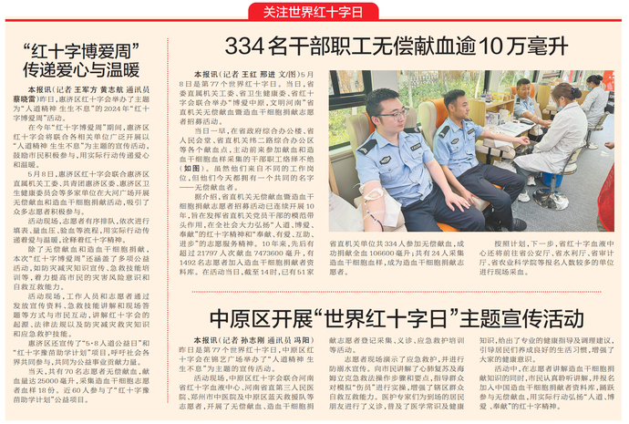5月8日是第77个世界红十字日。当日,省委直属机关工委、省卫生健康委、省红十字会联合举办“博爱中原,文明河南”省直机关无偿献血暨造血干细胞捐献志愿者招募活动。(今日《郑州日报》5版)