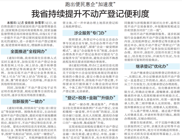 近日,省自然资源厅会同省国有资产监督管理委员会、国家税务总局河南省税务局、国家金融监督管理总局河南省监管局,印发《关于进一步提升不动产登记便利度促进营商环境优化的通知》,进一步提升不动产登记便利度,促进营商环境优化,增强群众获得感。(今日《郑州日报》5版)