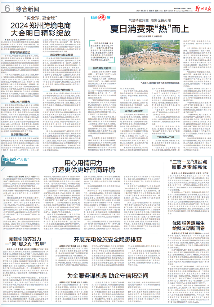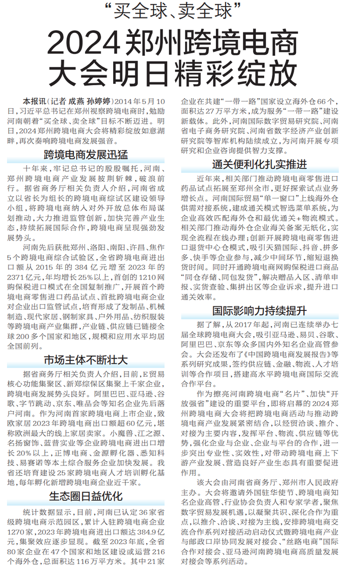 2014年5月10日,习近平总书记在郑州视察跨境电商时,勉励河南朝着“买全球、卖全球”目标不断迈进。明日,2024郑州跨境电商大会将精彩绽放如意湖畔,再次奏响跨境电商发展强音。(今日《郑州日报》6版)