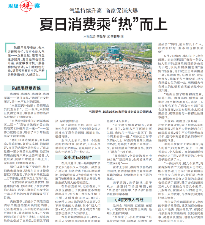 防晒用品受青睐、亲水游玩预售忙、夜市小吃人气旺……立夏已过,随着气温逐步回升,夏日经济也悄然升温,商家瞅准时机开展各种促销活动,人们也纷纷行动,提前预热夏日生活,不断为经济增长注入新活力。(今日《郑州日报》6版)