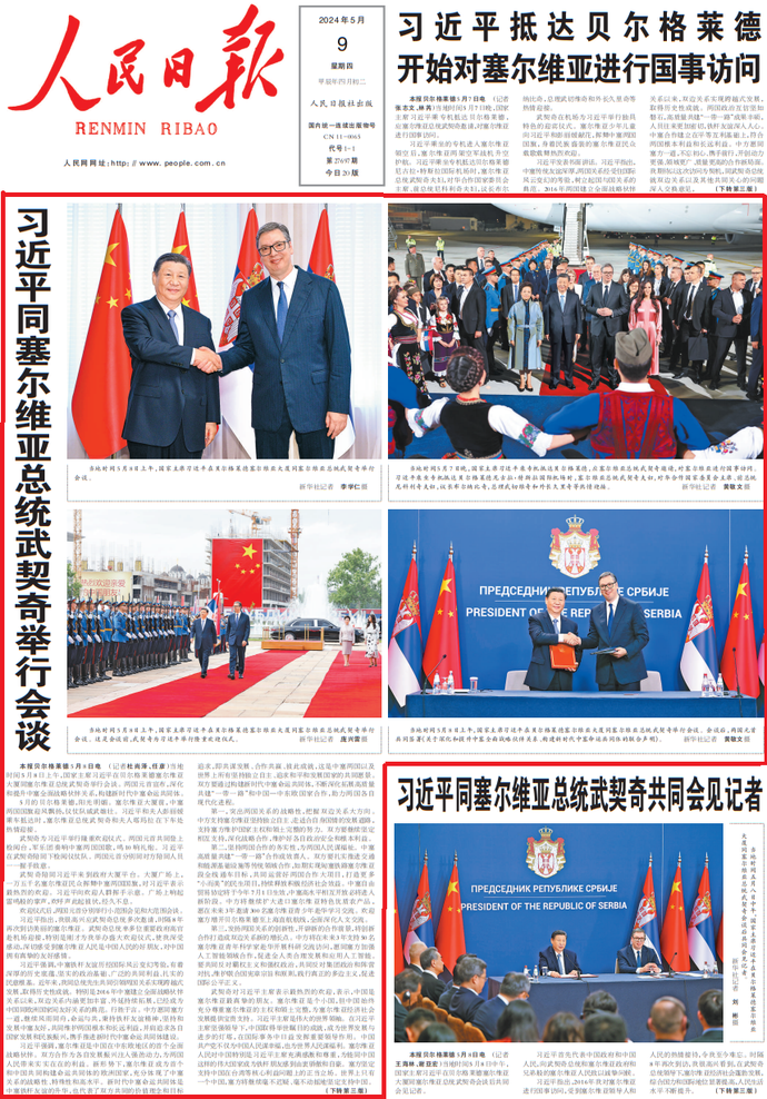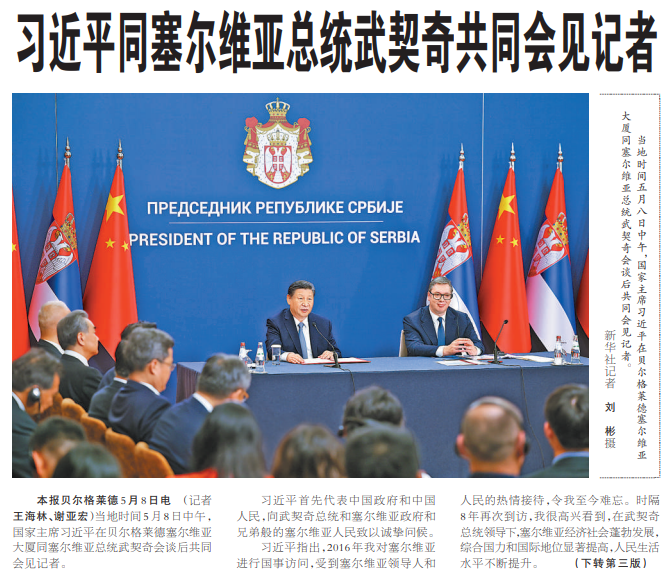 当地时间5月8日中午,国家主席习近平在贝尔格莱德塞尔维亚大厦同塞尔维亚总统武契奇会谈后共同会见记者。(今日《人民日报》1版、3版)