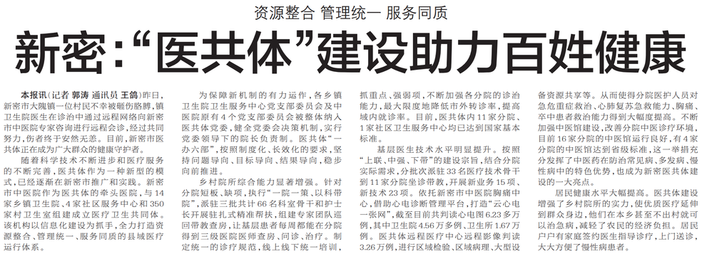昨日,新密市大隗镇一位村民不幸被砸伤胳膊,镇卫生院医生在诊治中通过远程网络向新密市中医院专家咨询进行远程会诊,经过共同努力,伤者终于安然无恙。目前,新密市医共体正在成为广大群众的健康守护者。(今日《郑州日报》7版)