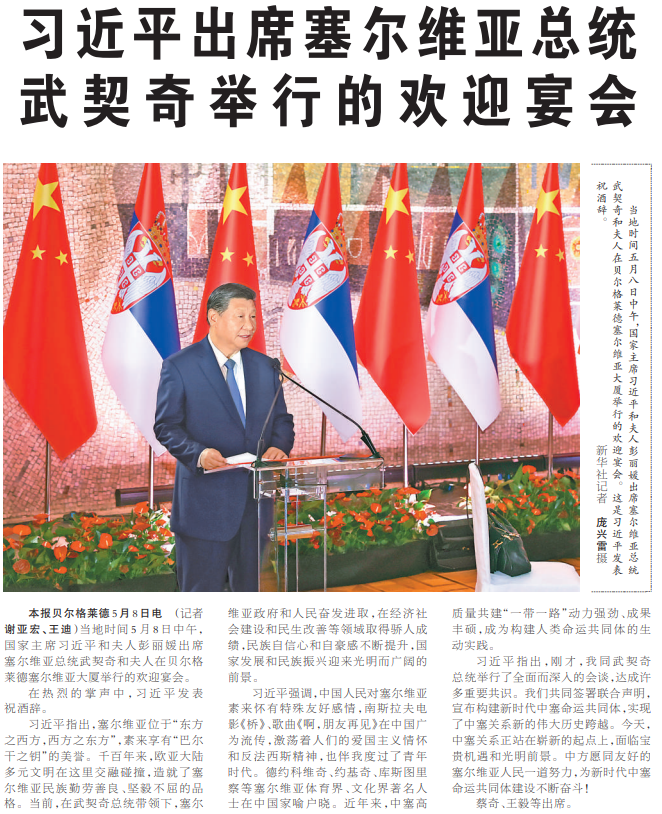 当地时间5月8日中午,国家主席习近平和夫人彭丽媛出席塞尔维亚总统武契奇和夫人在贝尔格莱德塞尔维亚大厦举行的欢迎宴会。(今日《人民日报》2版)
