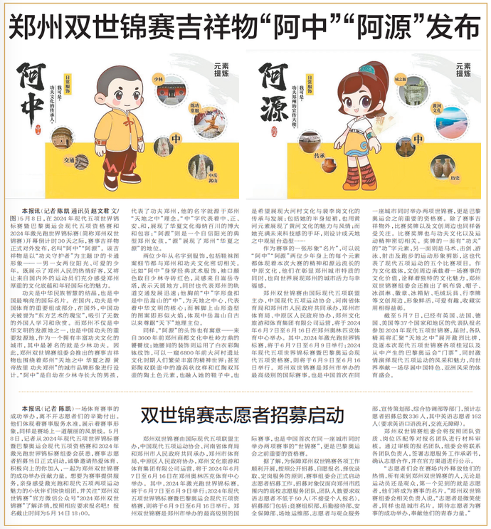 5月8日,在2024年现代五项世界锦标赛暨巴黎奥运会现代五项资格赛和2024年激光跑世界锦标赛(简称郑州双世锦赛)开幕倒计时30天之际,赛事吉祥物正式对外发布,名叫“阿中”“阿源”。该吉祥物是以“功夫守护者”为主题IP的卡通形象——一男一女两位阳光、可爱的少年。既展示了郑州人民的热情好客,又将让来自国内外的运动员们充分感受郑州厚重的文化底蕴和年轻国际化的魅力。(今日《郑州日报》8版)