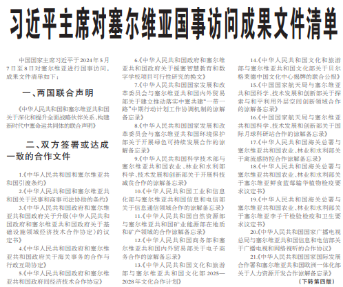 中国国家主席习近平于2024年5月7日至8日对塞尔维亚进行国事访问,成果文件清单如下: