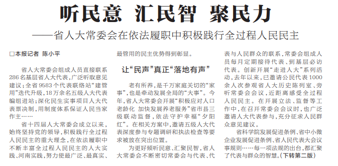 省人大常委会组成人员直接联系286名基层省人大代表,广泛听取意见建议;全省9583个代表联络站“建管用”迭代升级,18万余名五级人大代表编组进站;深化民生实事项目人大代表票决制,用制度体系保证人民当家作主……