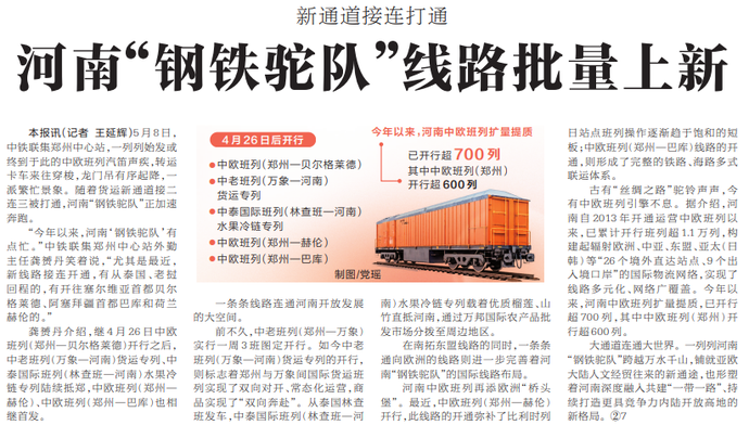 5月8日,中铁联集郑州中心站,一列列始发或终到于此的中欧班列汽笛声疾,转运卡车来往穿梭,龙门吊有序起降,一派繁忙景象。随着货运新通道接二连三被打通,河南“钢铁驼队”正加速奔跑。(今日《河南日报》3版)