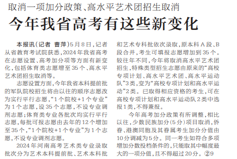 5月8日,记者从省教育考试院获悉,2024年我省高考在志愿设置、高考加分项等方面有新变化,包括体育类志愿增至35个、高水平艺术团招生取消等。(今日《河南日报》3版)