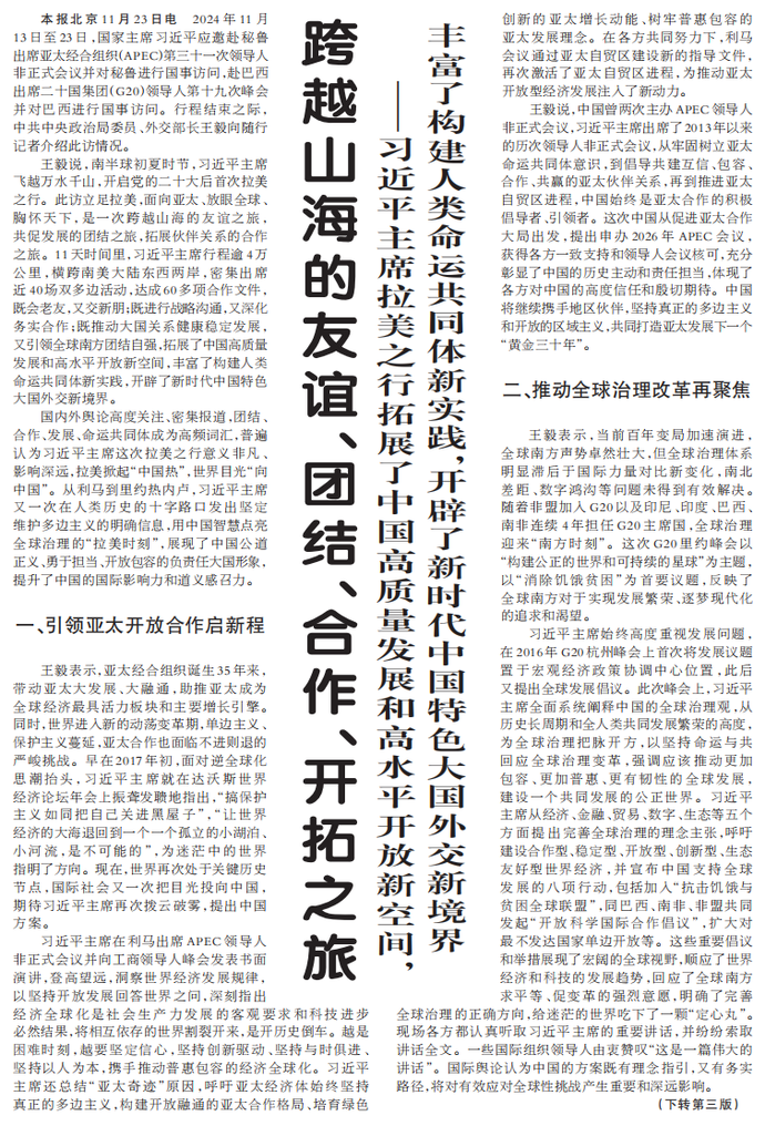 2024年11月13日至23日,国家主席习近平应邀赴秘鲁出席亚太经合组织(APEC)第三十一次领导人非正式会议并对秘鲁进行国事访问,赴巴西出席二十国集团(G20)领导人第十九次峰会并对巴西进行国事访问。行程结束之际,中共中央政治局委员、外交部长王毅向随行记者介绍此访情况。(今日《人民日报》1版、3版)