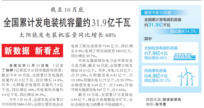 记者近日从国家能源局获悉:截至今年10月底,全国累计发电装机容量约31.9亿千瓦,同比增长14.5%。其中,太阳能发电装机容量约7.9亿千瓦,同比增长48%;风电装机容量约4.9亿千瓦,同比增长20.3%。(今日《人民日报》1版)
