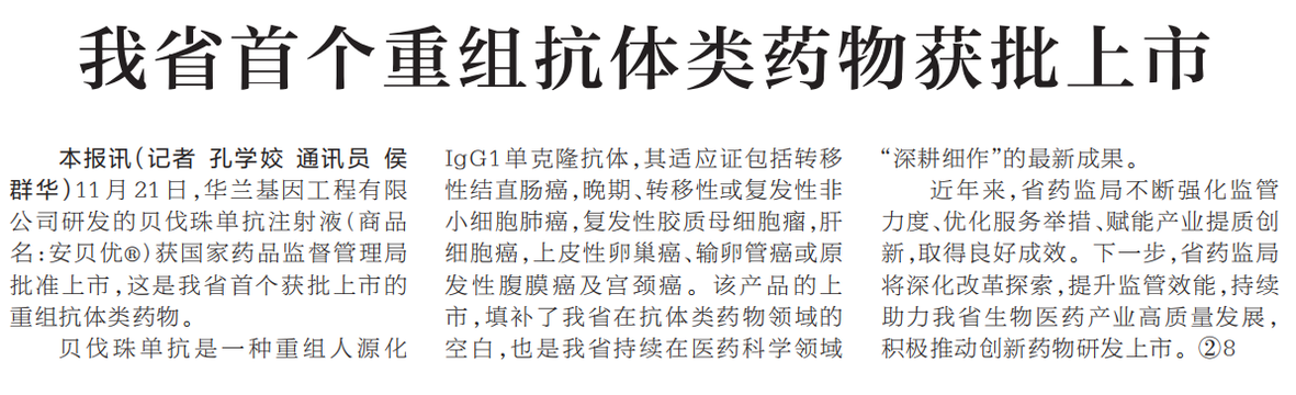 11月21日,华兰基因工程有限公司研发的贝伐珠单抗注射液(商品名:安贝优®)获国家药品监督管理局批准上市,这是我省首个获批上市的重组抗体类药物。(今日《河南日报》1版)