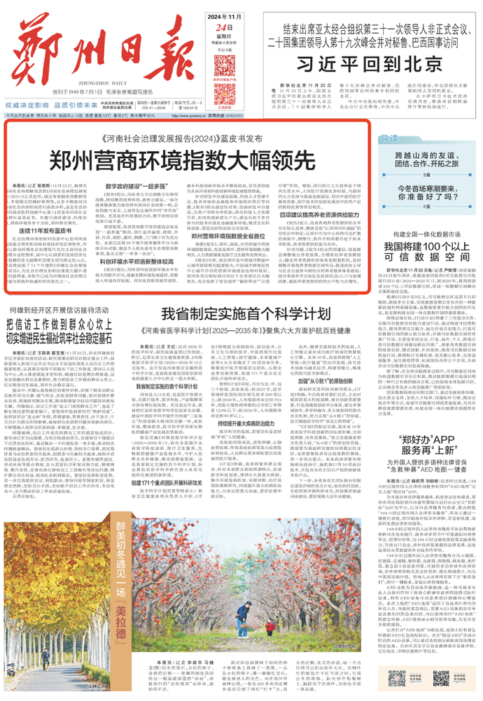11月23日,被誉为河南社会治理晴雨表的《河南社会治理发展报告(2024)》正式发布,通过客观精准的数据资料、丰富翔实的调研案例等,从多个维度对河南省社会治理状况进行系统分析,这是社会治理河南省协同创新中心第11次发布河南社会治理年度蓝皮书。在数字政府建设、科技创新、营商环境等多个方面,郑州排名领先。(今日《郑州日报》1版)