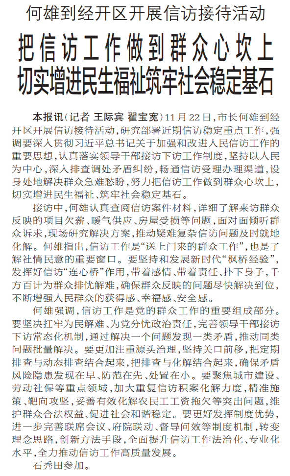 11月22日,市长何雄到经开区开展信访接待活动,研究部署近期信访稳定重点工作,强调要深入贯彻习近平总书记关于加强和改进人民信访工作的重要思想,认真落实领导干部接访下访工作制度,坚持以人民为中心,深入排查调处矛盾纠纷,畅通信访受理办理渠道,设身处地解决群众急难愁盼,努力把信访工作做到群众心坎上,切实增进民生福祉、筑牢社会稳定基石。(今日《郑州日报》1版)