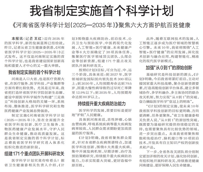 迈向2035年的医学科学,新的发展蓝图已经绘就。昨日,记者从省卫生健康委获悉,《河南省医学科学计划(2025—2035年)》正式发布。这不仅是河南制定实施的首个科学计划,也是我省建设国家创新高地和重要人才中心的又一重大举措。(今日《郑州日报》1版)