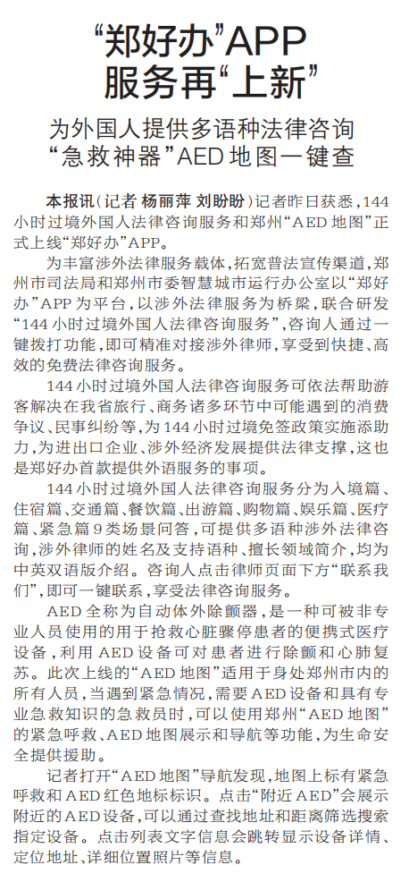 记者昨日获悉,144小时过境外国人法律咨询服务和郑州“AED地图”正式上线“郑好办”APP。(今日《郑州日报》1版)