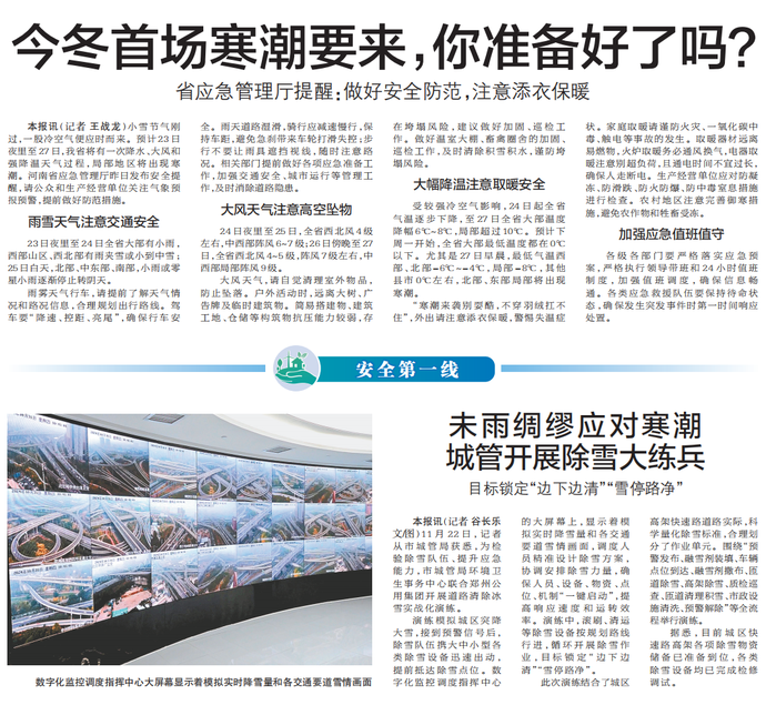 11月22日,省气象台预报,受低槽与较强冷空气共同影响,23日夜间至27日,我省将迎来一轮雨雪、大风及强降温天气过程。此次天气过程波及范围广、影响强度大,各地需尽早采取防范措施。(今日《河南日报》4版)