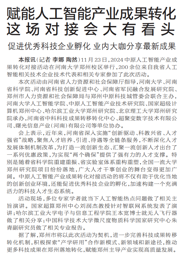 11月23日,2024中原人工智能产业成果转化对接活动在河南大学郑州校区举行,200余位来自我省人工智能相关技术企业技术代表和相关专家参加了此次活动。(今日《郑州日报》2版)