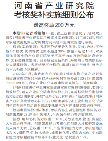 河南省产业研究院考核奖补实施细则公布