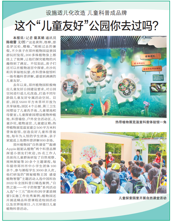 “这是黄荆、柽柳,那是罗汉松、榔榆。”刚刚过去的暑假,不少孩子在郑州植物园盆景园游玩时发现,200多株植物身上都挂上了铭牌,让他们探究植物的兴趣得到了满足。不仅如此,孩子们还可以在植物迷宫中探索,在沙坑和共享绿地玩耍,在科普体验馆听一场有趣科普讲解,感受到满满的儿童友好。(今日《郑州日报》1版)