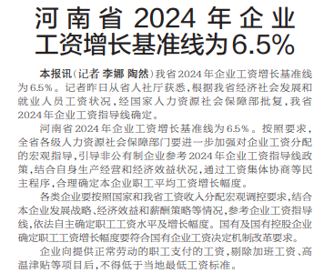 河南省2024年企业工资增长基准线为6.5%