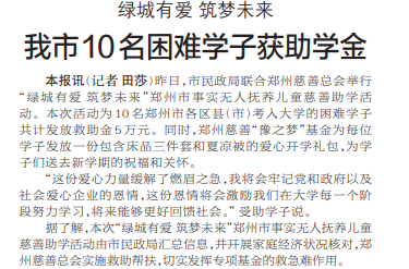 昨日,市民政局联合郑州慈善总会举行“绿城有爱 筑梦未来”郑州市事实无人抚养儿童慈善助学活动。本次活动为10名郑州市各区县(市)考入大学的困难学子共计发放救助金5万元。同时,郑州慈善“豫之梦”基金为每位学子发放一份包含床品三件套和夏凉被的爱心开学礼包,为学子们送去新学期的祝福和关怀。(今日《郑州日报》1版)