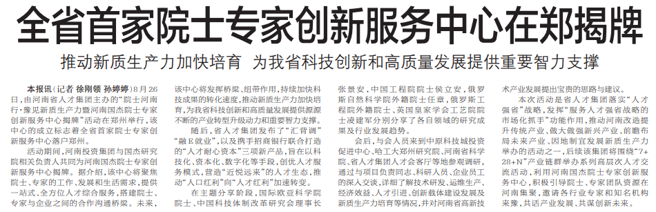 8月26日,由河南省人才集团主办的“院士河南行·豫见新质生产力暨河南国杰院士专家创新服务中心揭牌”活动在郑州举行,该中心的成立标志着全省首家院士专家创新服务中心落户郑州。(今日《郑州日报》2版)