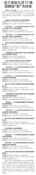 8月27日,记者从市人社局获悉,9月份,郑州市就业创业服务中心将以“白+黑”“常态+专项”活动形式在所属三个人力资源市场和部分商圈开展17场线下招聘会。(今日《郑州日报》2版)