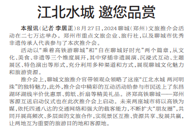 8月27日,2024聊城(郑州)文旅推介会活动在二七万达举办。郑州市重点文旅企业、旅行社,以及聊城市优秀非遗传承人代表参与了本次推介会。(今日《郑州日报》2版)