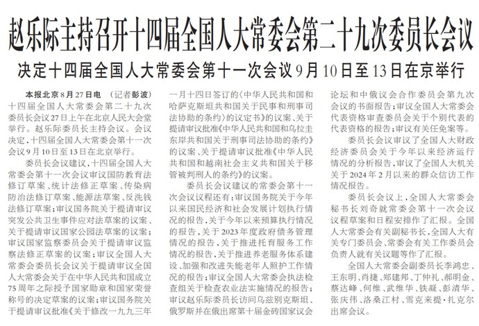 十四届全国人大常委会第二十九次委员长会议27日上午在北京人民大会堂举行。赵乐际委员长主持会议。会议决定,十四届全国人大常委会第十一次会议9月10日至13日在北京举行。(今日《人民日报》1版)