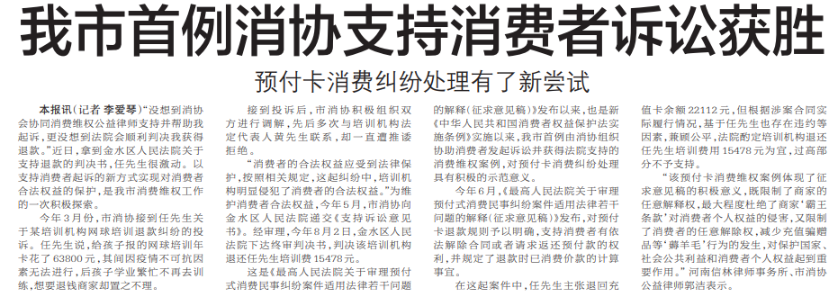 我市首例消协支持消费者诉讼获胜
