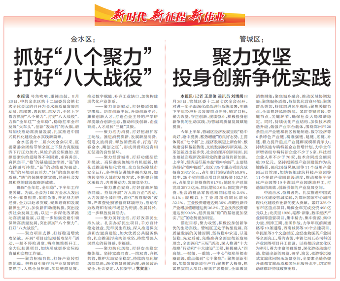号角吹响,重锤击鼓。8月26日,中共金水区第十二届委员会第七次全体会议的召开为金水高质量发展再动员、再部署、再起航、再发力,全区上下誓言抓好“八个聚力”,打好“八大战役”,力保“全年红”“全年稳”,稳稳扛牢全市发展“火车头”、创新“发动机”的大旗,谱写加快推动高质量发展、扎实推进中国式现代化建设金水实践新篇章。(今日《郑州日报》7版)