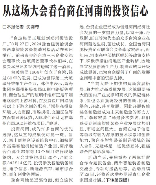“台玻集团正规划到郑州投资设厂。”8月27日,2024豫台经贸洽谈会暨两岸智能装备制造对接活动在郑州举行。前来参会的台湾三三企业交流会理事长、台玻集团董事长林伯丰,在接受本报记者采访时透露了这一消息。(今日《河南日报》1版、4版)