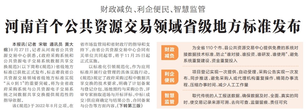 河南首个公共资源交易领域省级地方标准发布
