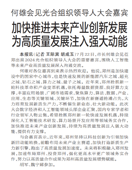 7月22日,市长何雄会见莅郑出席2024光合组织领导人大会的重要嘉宾,围绕人工智能等未来产业高质量发展深入沟通交流。(今日《郑州日报》1版)