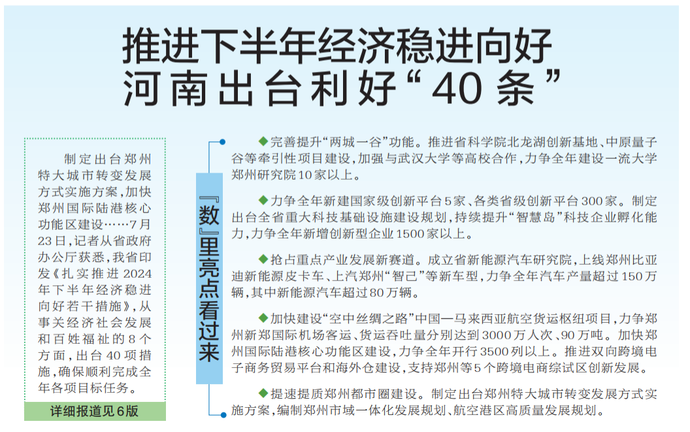 制定出台郑州特大城市转变发展方式实施方案,加快郑州国际陆港核心功能区建设……7月23日,记者从省政府办公厅获悉,我省印发《扎实推进2024年下半年经济稳进向好若干措施》,从事关经济社会发展和百姓福祉的8个方面,出台40项措施,确保顺利完成全年各项目标任务。(今日《郑州日报》1版、6版)