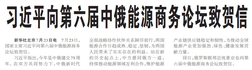 7月23日,国家主席习近平向第六届中俄能源商务论坛致贺信。