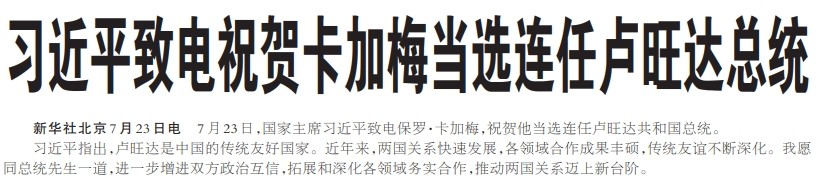 7月23日,国家主席习近平致电保罗·卡加梅,祝贺他当选连任卢旺达共和国总统。(今日《人民日报》1版)