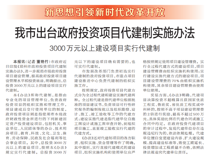 市政府近日印发《郑州市政府投资项目代建制实施办法》,进一步规范市级政府投资项目建设管理,提高政府投资项目建设管理水平和投资效益,明确提出,总投资3000万元以上的建设项目实行代建制。(今日《郑州日报》2版)