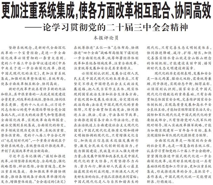 坚持系统观念,是新时代全面深化改革的一个宝贵经验,是进一步全面深化改革必须贯彻的一条重大原则。党的二十届三中全会审议通过的《中共中央关于进一步全面深化改革、推进中国式现代化的决定》,更加注重系统集成,加强对改革整体谋划、系统布局,使各方面改革相互配合、协同高效。(今日《人民日报》1版)