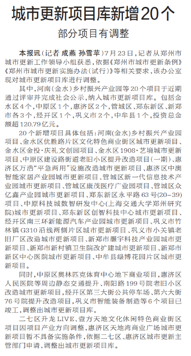 7月23日,记者从郑州市城市更新工作领导小组获悉,依据《郑州市城市更新条例》《郑州市城市更新实施办法(试行)》等相关要求,该办公室现对城市更新项目库进行调整。(今日《郑州日报》2版)