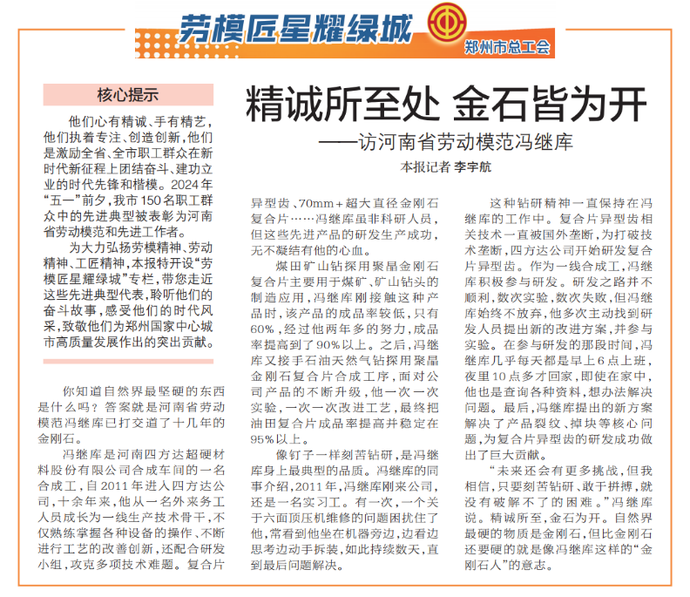 冯继库是河南四方达超硬材料股份有限公司合成车间的一名合成工,自2011年进入四方达公司,十余年来,他从一名外来务工人员成长为一线生产技术骨干,不仅熟练掌握各种设备的操作、不断进行工艺的改善创新,还配合研发小组,攻克多项技术难题。复合片异型齿、70mm+超大直径金刚石复合片……冯继库虽非科研人员,但这些先进产品的研发生产成功,无不凝结有他的心血。(今日《郑州日报》2版)
