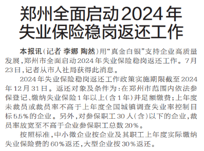 用“真金白银”支持企业高质量发展,郑州市全面启动2024年失业保险稳岗返还工作。7月23日,记者从市人社局获得此消息。(今日《郑州日报》2版)