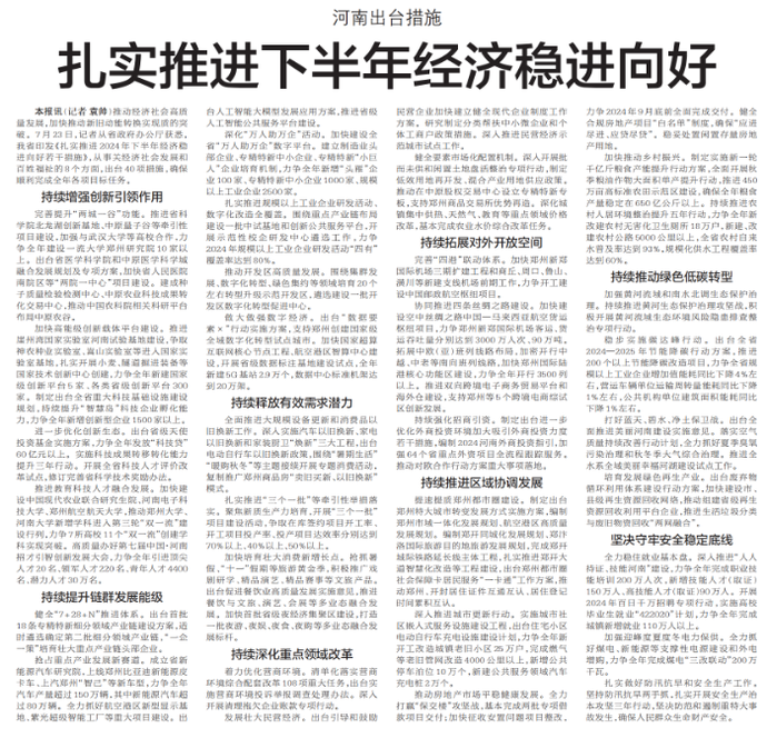 推动经济社会高质量发展,加快推动新旧动能转换实现质的突破。7月23日,记者从省政府办公厅获悉,我省印发《扎实推进2024年下半年经济稳进向好若干措施》,从事关经济社会发展和百姓福祉的8个方面,出台40项措施,确保顺利完成全年各项目标任务。(今日《郑州日报》6版)